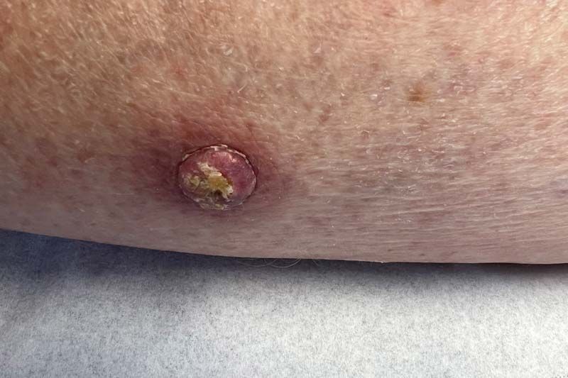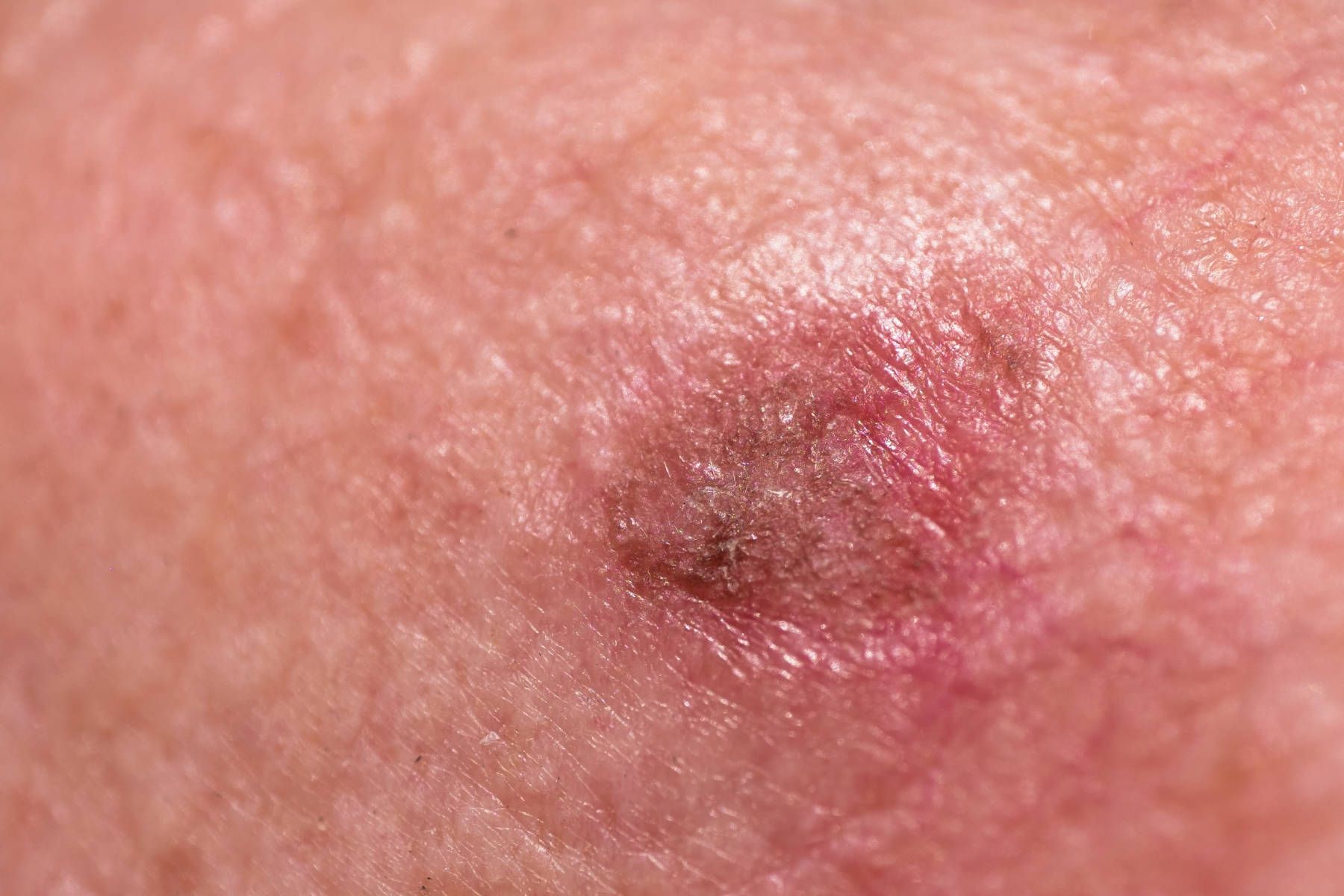 Shiny bumps, flat patches, or sores that don’t heal. Slow-growing and rarely spreads.